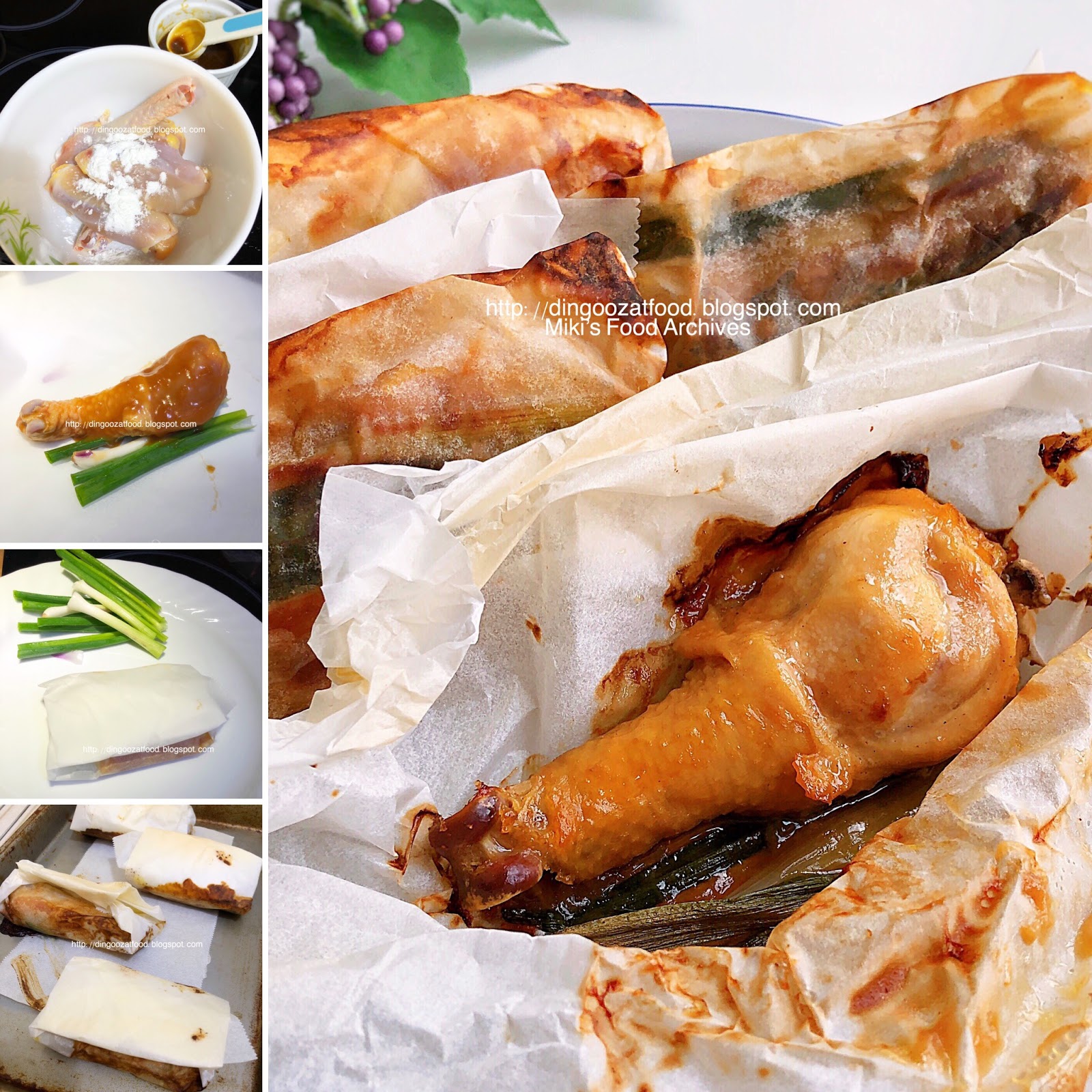 Place one piece of ham one green onion one slice mushroom and two slices of chicken. Wrap in the left and right side of the paper just like an envelope wrapping. Drizzle with 1 teaspoon of marinade. Grease the grease proof paper with oil mixture. Paper-wrapped chicken is normally wrapped envelope style.